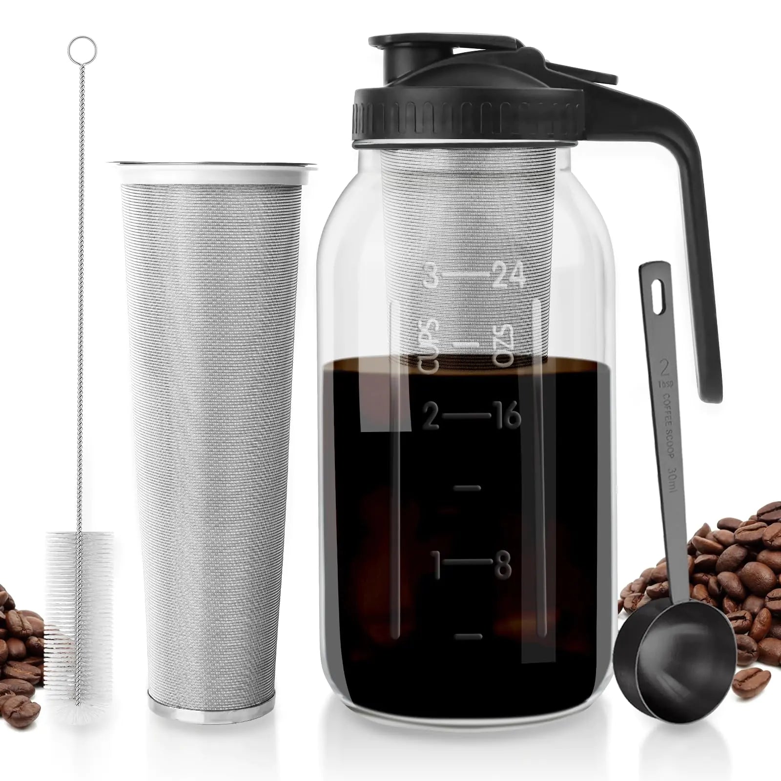 ["【Whats Included】: 1 x 64 oz Mason Jar Pitcher with Pour Spout Lid 1 x Stainless Steel Filter 1 x 30ml Stainless Steel Measuring Tablespoon 1 x Cleaning Brush. Enjoy ample capacity for daily use. Please Note: Avoid rapid temperature changes as this pitcher is not suitable for hot-to-cold transfers." 【Premium Material】: Crafted with heavy-duty food-grade soda lime glass this glass cold brew coffee pitcher ensures durability and long-lasting use. The BPA-free plastic lid adds convenience and safety providing a reliable seal. Say goodbye to easily cracked pitchers with this high-quality option. 【Easy Pour Spout Handle Lid】: Featuring an ergonomically thickened handle this cold brew coffee pitcher offers a secure grip and effortless portability. The airtight spout and silicone ring prevent spills and odors preserving beverage freshness in the fridge. With its flip cap lid design this pitcher doubles as an easy pour dispenser for convenient pouring and storage. 【Ultra-Fine Mesh Filter】: Boasting a 160-micron weave metal mesh our cold brew coffee maker filter is crafted from premium food-grade 304 stainless steel. This ensures no coffee grounds enter the mason jar guaranteeing a smooth and delightful coffee experience. Moreover the filter effectively strains out tea leaves fruit pits and other beverage residues. Remove the filter and the pitcher transforms into a versatile storage container or glass pitcher for other drinks. 【Effortless Filling and Cleaning】: The wide-mouth design of the mason jar coffee pitcher makes it effortless to fill with your favorite beverages like cold brew coffee iced tea lemonade and more. Cleaning this cold brew coffee pitcher is a breeze – simply toss it in the dishwasher or wash it by hand for a sparkling clean finish.]