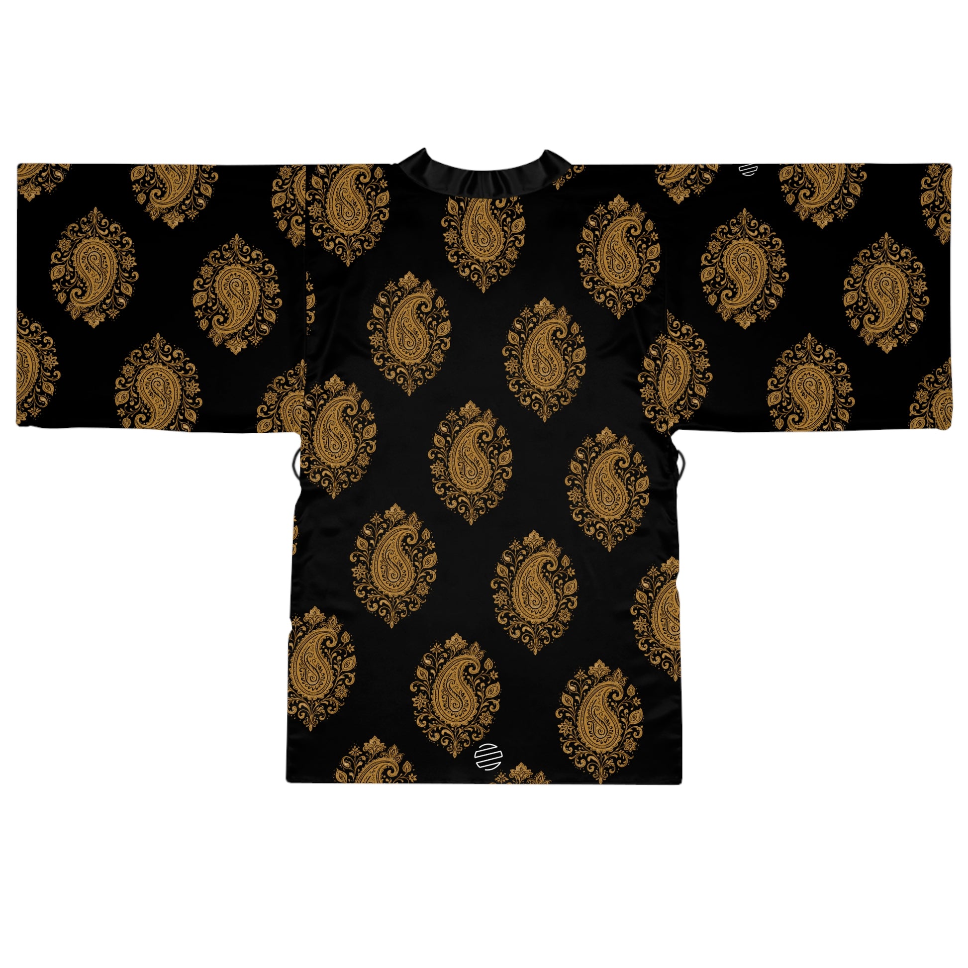 Black & Gold Paisley Kimono Robe - Long Sleeve Japanese Style Wrap