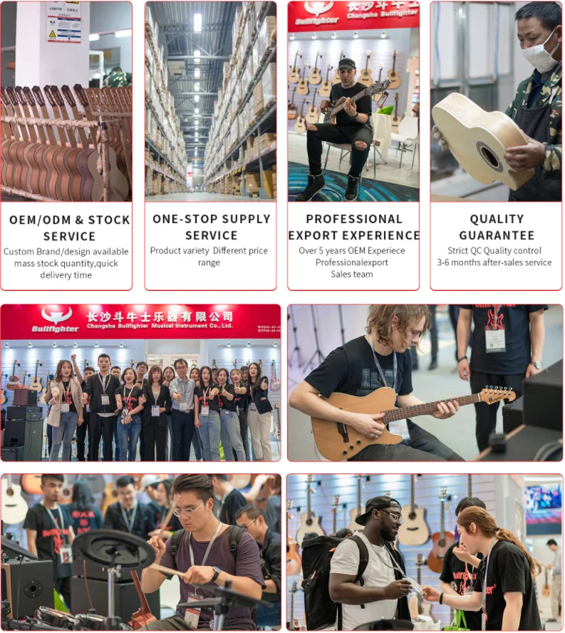 Changsha bullfighter musical instrument co., Ltd was established in 2015, is a professional manufacturer engaged in the research,development, production, sale and service of musical instruments. We have focused on top-quality guitar, drum sets, wind instruments for 5 years. We started as a small operation, but now we are a government-supporting enterprise importing and exporting musical instruments. Our main products are including Amplifiers and Acoustic Guitars, Electric Guitars, drum sets,saxophone and other instruments, etc. Over the years, we have been cooperating with many big brands and famous companies to develop products. Our Products are selling to dozens of areas and countries including Europe, South and North America, Asia,Oceania, etc. Also, our Products have received good feedbacks and become popular among customers, share a high reputation from domestic and foreign markets. We have established our own brand "Bullfighter""minsine””Lanyun”, integrating delicate craft,scientific product structure and spirit of many world-famous brands. At present, we have two production workshops covering 12,000 square meters, one of which produces 15,000 acoustic and electric guitars and another produces 1000 sets of speakers and electronic drums every month. We have an excellent R & D team, based on technological innovation, market-oriented, continuously produce new products to meet consumer demand.