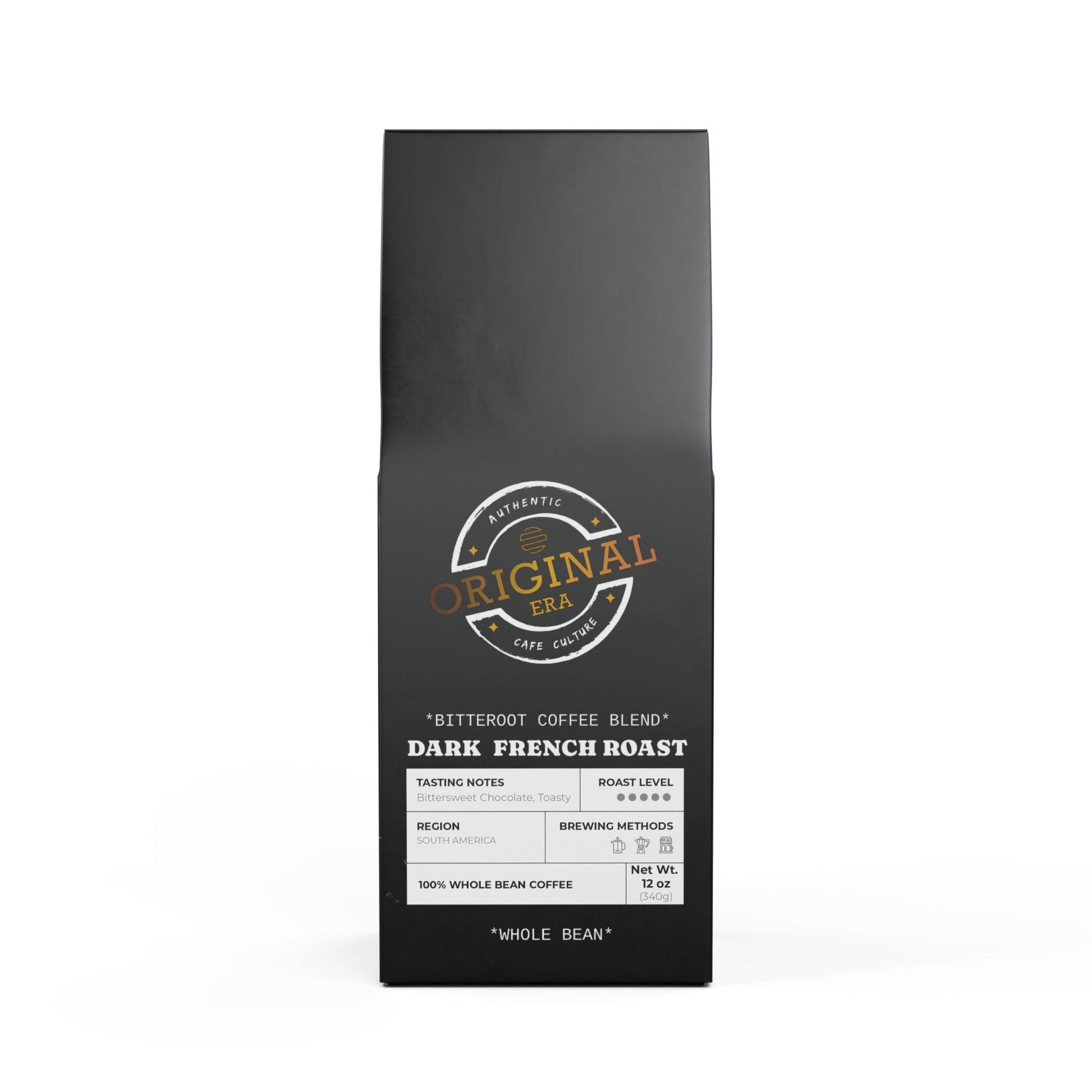 If you love coffee with a strong personality and deep flavors then the Bitterroot Coffee Blend is made for you. This 12oz package features a Dark French roast, delivering a bittersweet and toasty flavor profile with a strong finish along with rich flavors of cocoa and toasted nuts. Sourced from South America, this blend is meant to be enjoyed by brewing in your drip coffee maker, French press, or percolator. Available in whole bean and ground options. Roasted with care in the USA from ingredients sourced worldwide.