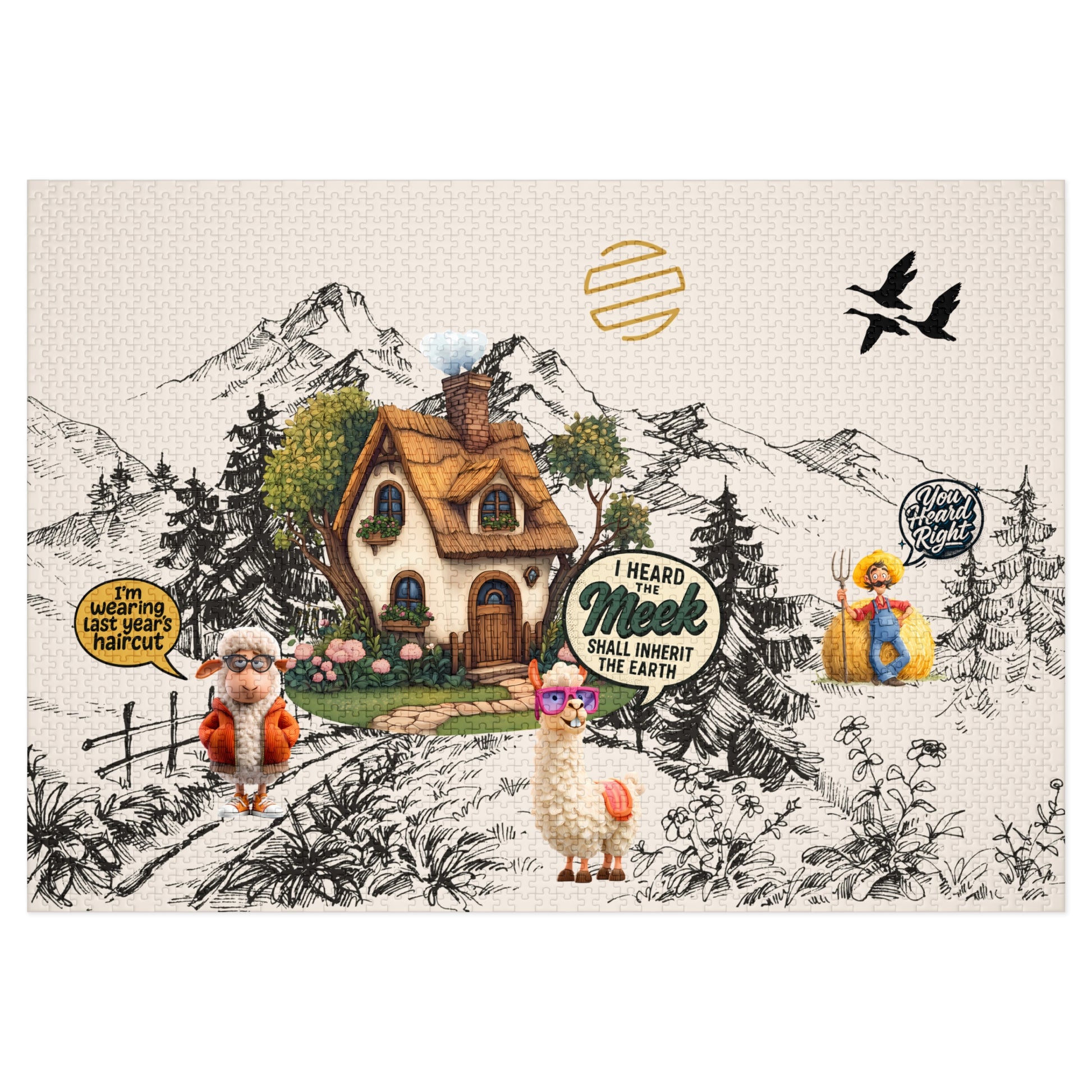 Spread across each piece is a quiet, wry declaration: “The Meek Shall Inherit the Earth.” This puzzle invites slow, intentional assembling — a meditative ritual as colors click together and the message emerges. The glossy image and vivid inks keep every tonal shift and tiny detail alive while you work. Packed in a white metal tin that wears the finished art on its lid, it’s easy to carry to a friend’s gathering or slide into a shelf for rainy afternoons. Whether you’re untangling thoughts, sharing moments with fellow puzzlers, or setting a contemplative tone for a solitary evening, this puzzle turns patience into a statement and the act of finishing into quiet satisfaction.