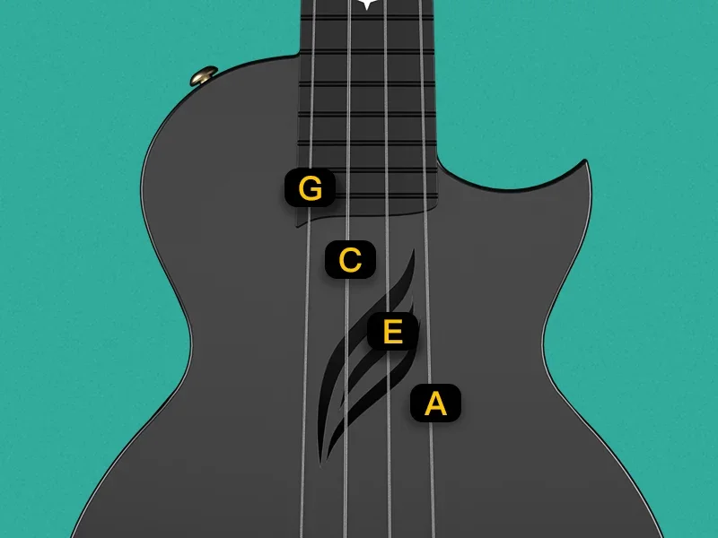 The standard C tuning features strings tuned to G, C, E, and A(From the left to the right when you put the ukulele straight and facing the front as the left picture shows). You may begin your tuning with the 3rd string, which is the note C, the G-E-A.