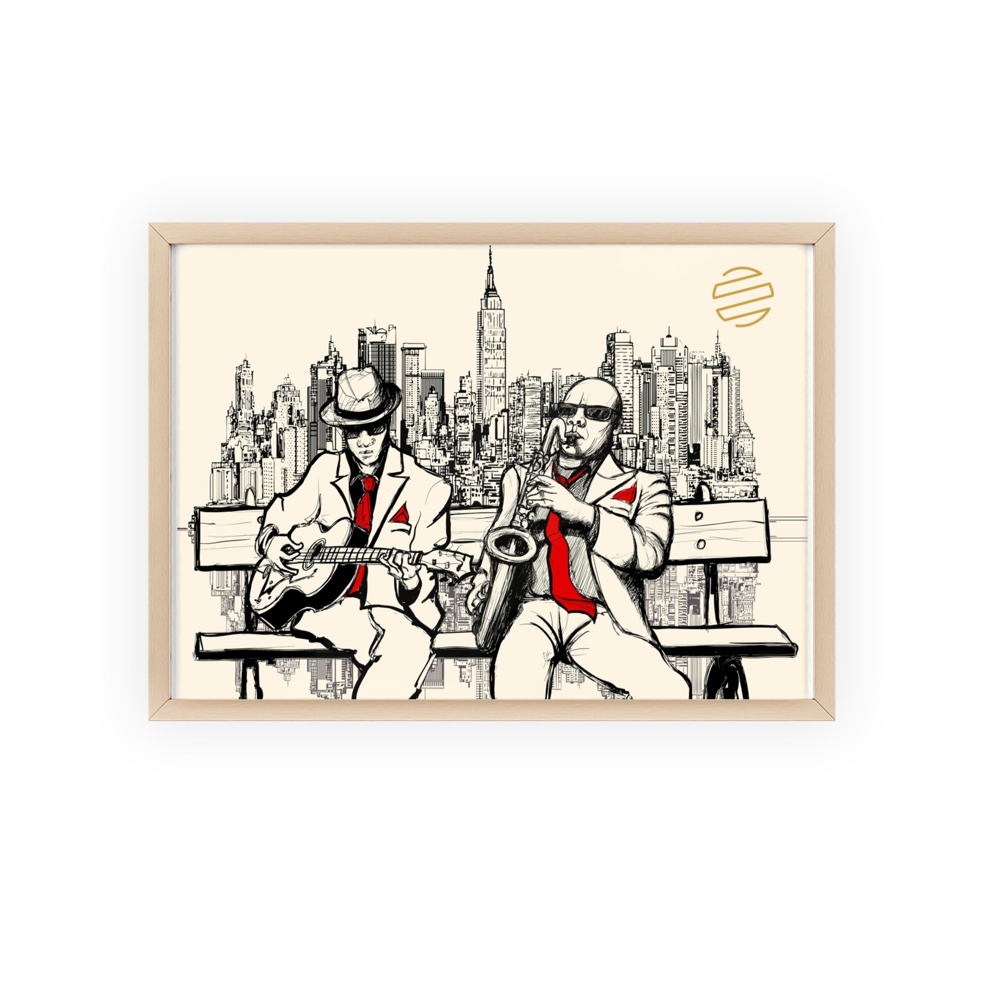 Jazz Duo Cityscape Poster with Wooden Frame — Vintage NYC Musicians Wall Art