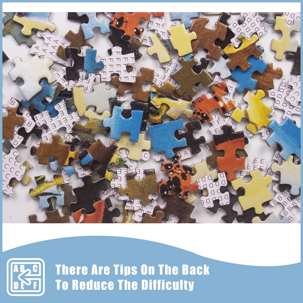 🧩It contain 1000 pieces puzzles and poster, back sides of pieces are divided into several areas with letters A-F, the finished size is 26.75”x19.25”, the box size is 7.87”x7.87”x1.97”.