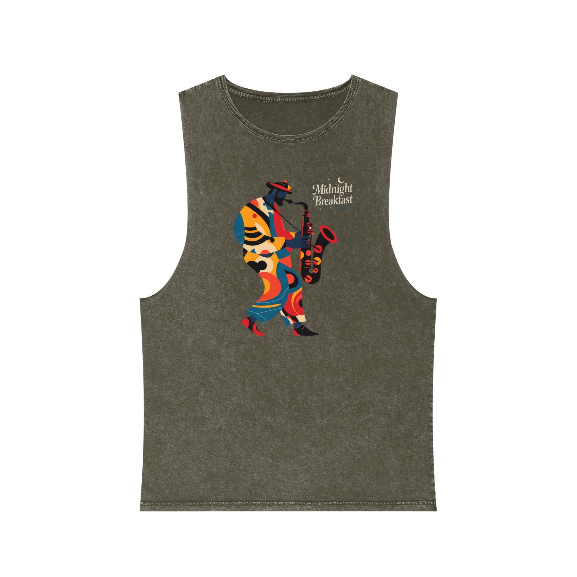 Late-night grooves, warm amber streetlights, and the hush after the last set—this tank carries that mood. The saxophone silhouette sits low and confident, like a nocturnal melody stitched into faded cotton. Wear it to late-night jam sessions, slow walks home, or when you want your outfit to echo smoky club energy. The raw cut sleeves and stonewashed finish lend a worn-in authenticity that feels lived in from the first wear. Lightweight and breathable, it layers easily under a leather jacket or stands alone during summer rehearsals. This is for people who keep time by rhythm, not by the clock—players, listeners, and night-shift dreamers who move to jazz after midnight.
