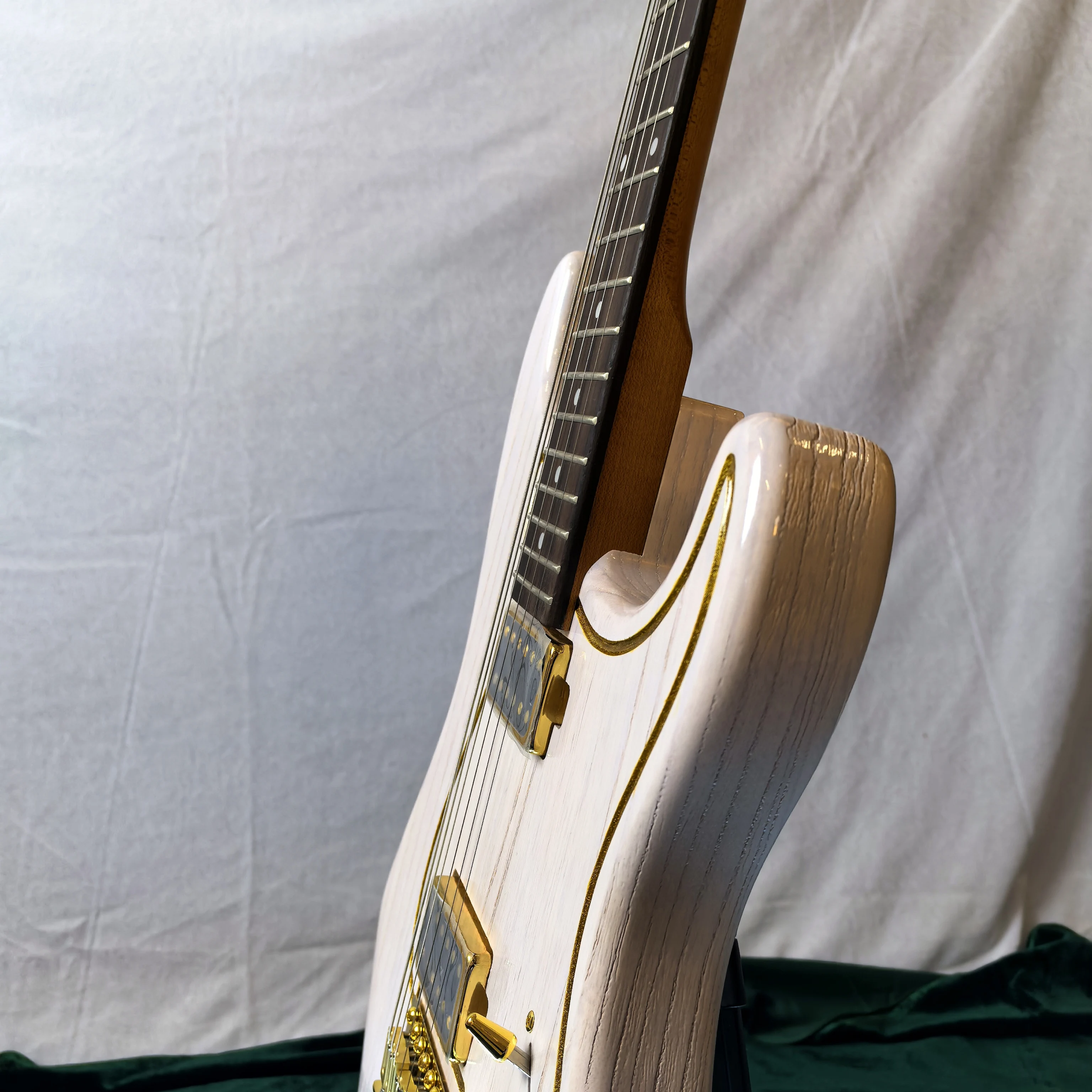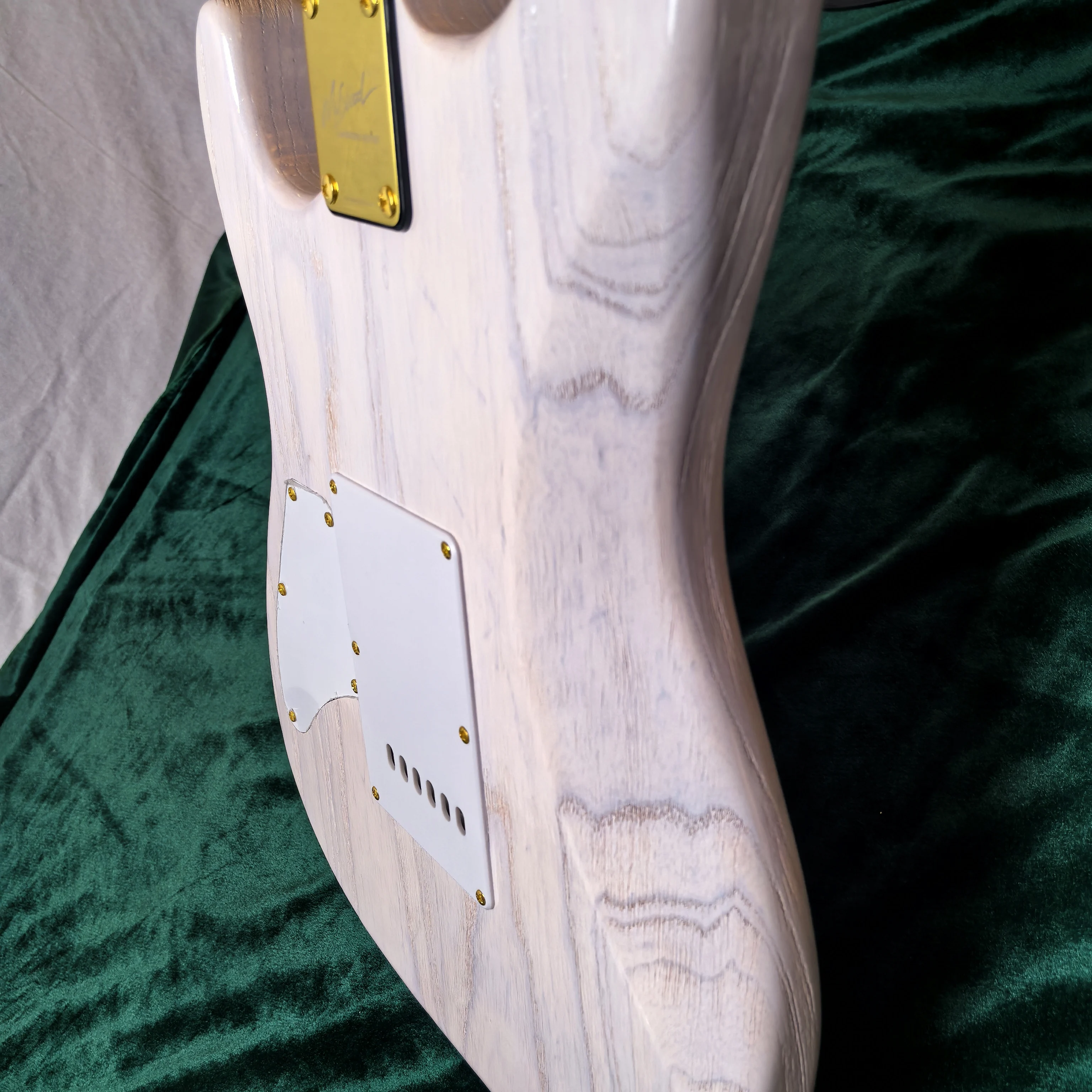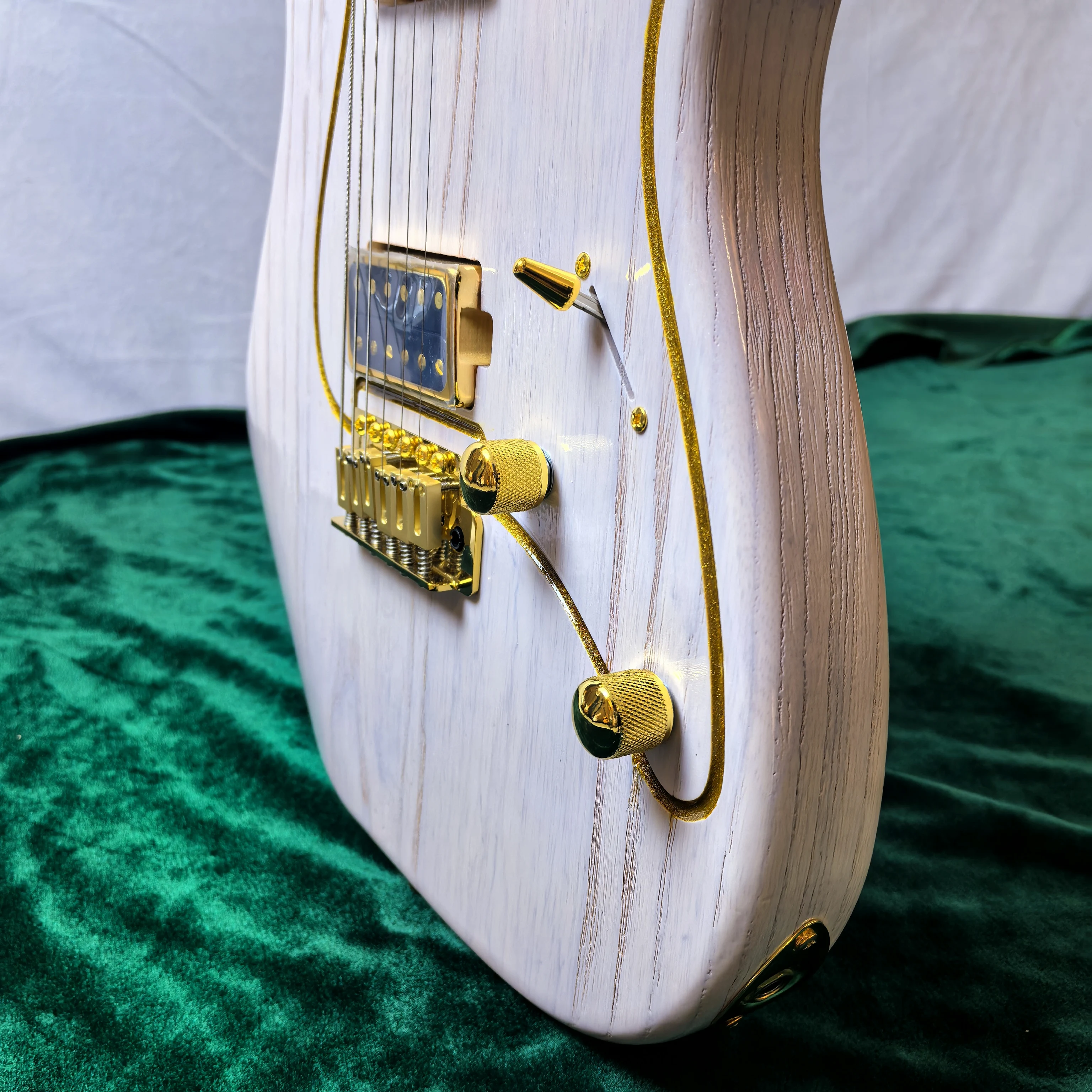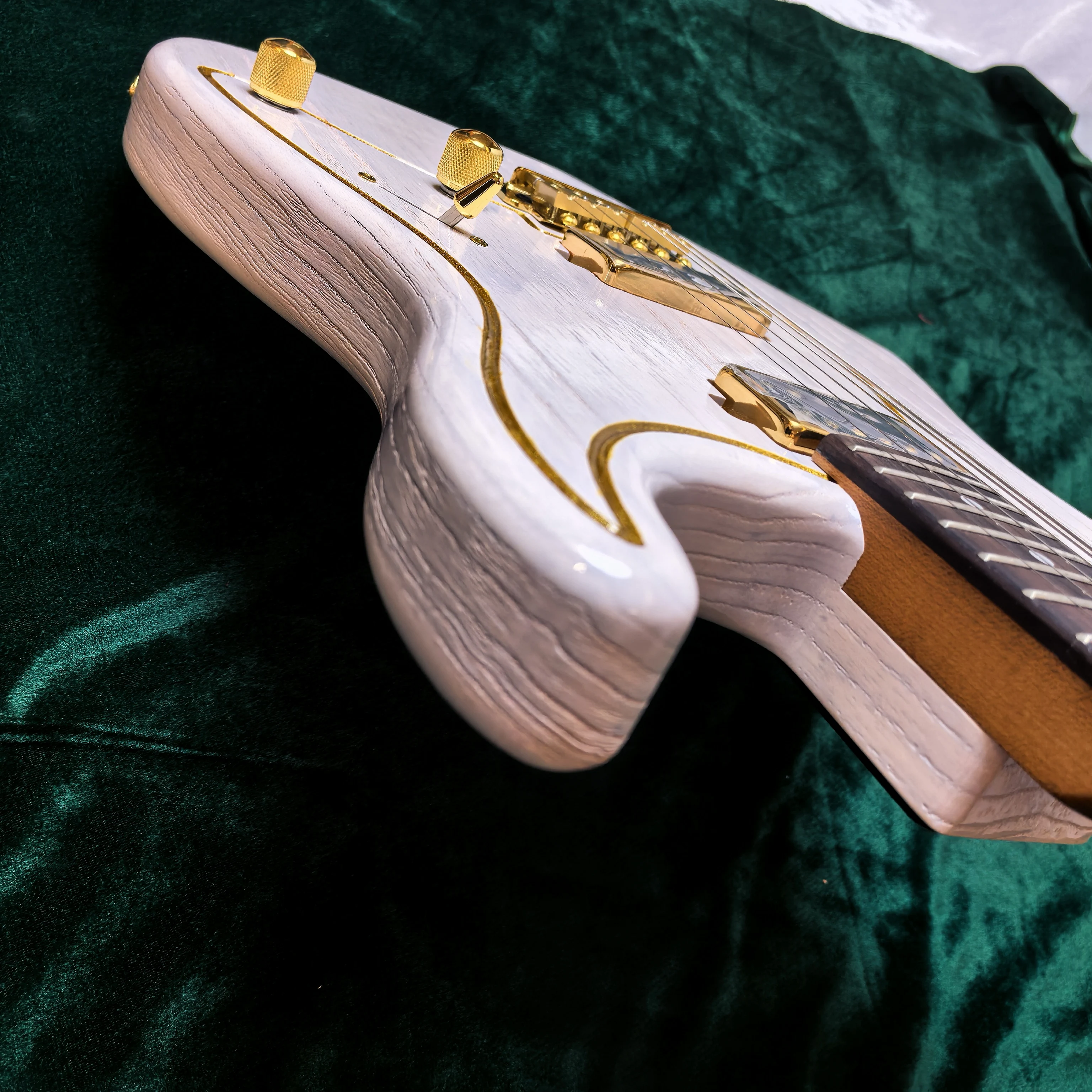 New product: White ash wood body with distinct wood grain, golden locking tuning pegs, no fingerboard, golden accessories, and a baked maple neck!