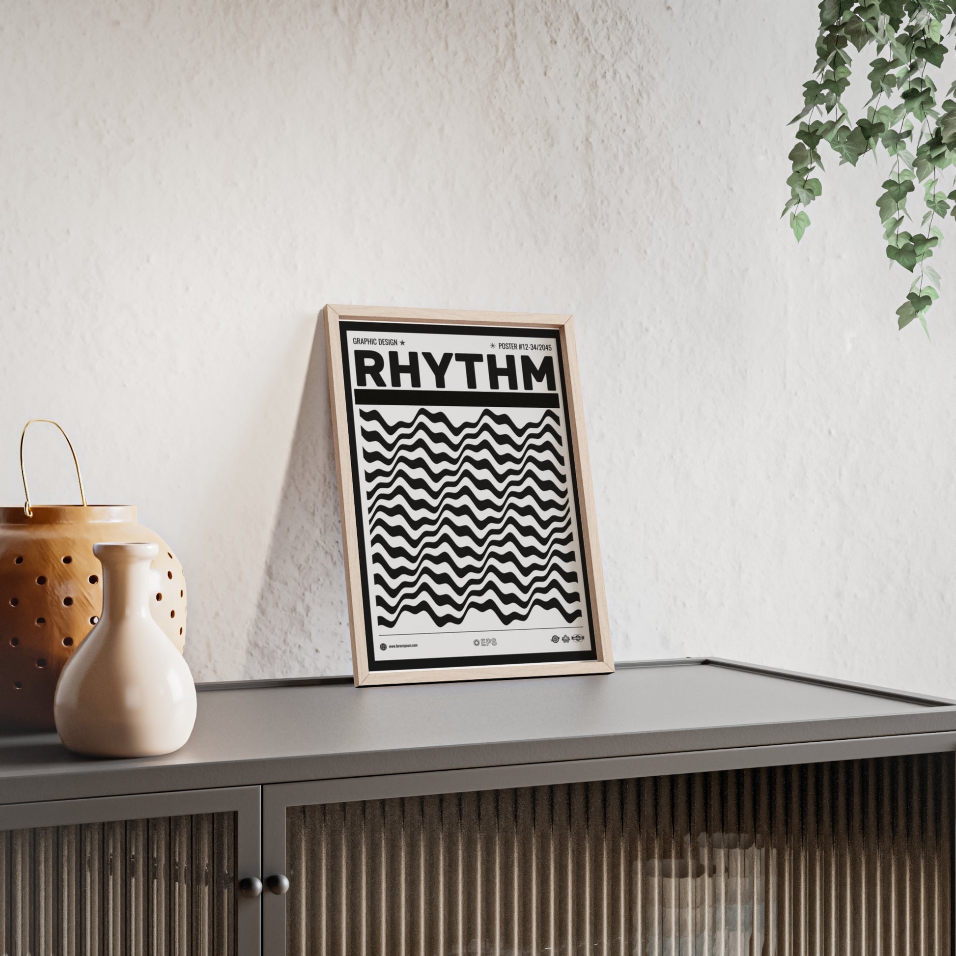 Rhythm Wave Art Poster with Wooden Frame — Black & White Modern Wall Print