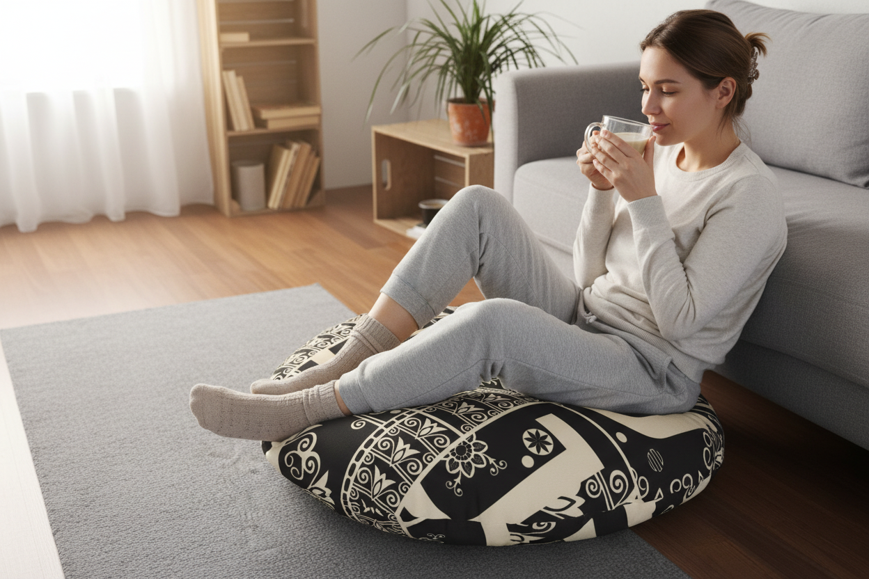 This round tufted floor pillow brings a bold, graphic edge to quiet corners. The high-contrast black and cream Jojo geometry reads modern and grounded — like a statement rug scaled down for lounging. Sit low with a book, layer it beside woven rugs, or let it anchor a minimalist reading nook. The sturdy tuft and dense polyester fill hold shape under frequent use, giving you a reliable perch for coffee-sipping mornings or slow, late-night conversations. The double-sided print keeps the design visible from any angle, while the crisp, high-contrast pattern blends with natural textures and sculptural furniture. It feels deliberate and considered: sculptural enough to catch the eye, soft enough to invite you to stay a while.