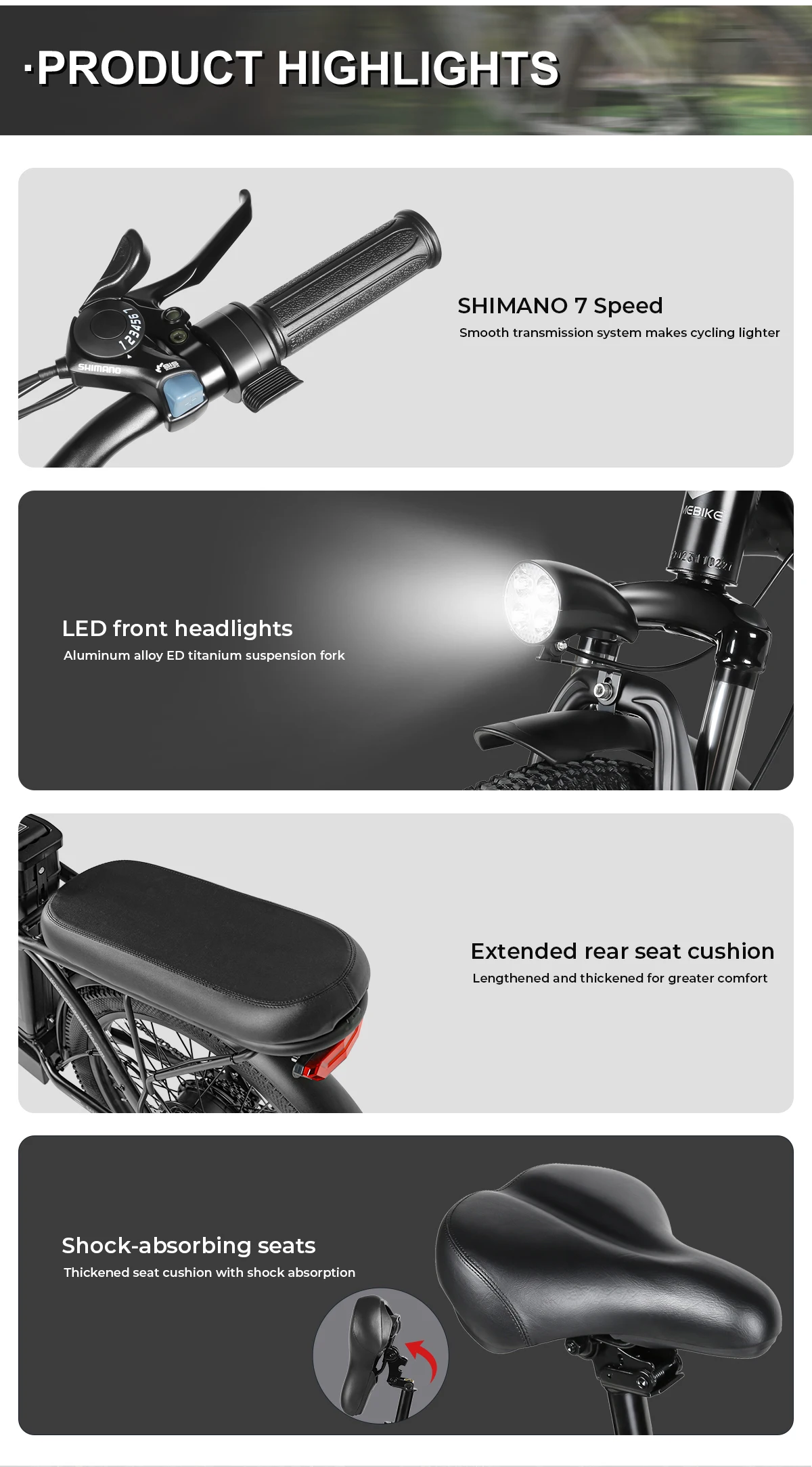 Equipped with 250W brushless motor and a 36V 12Ah Removable lithium battery.