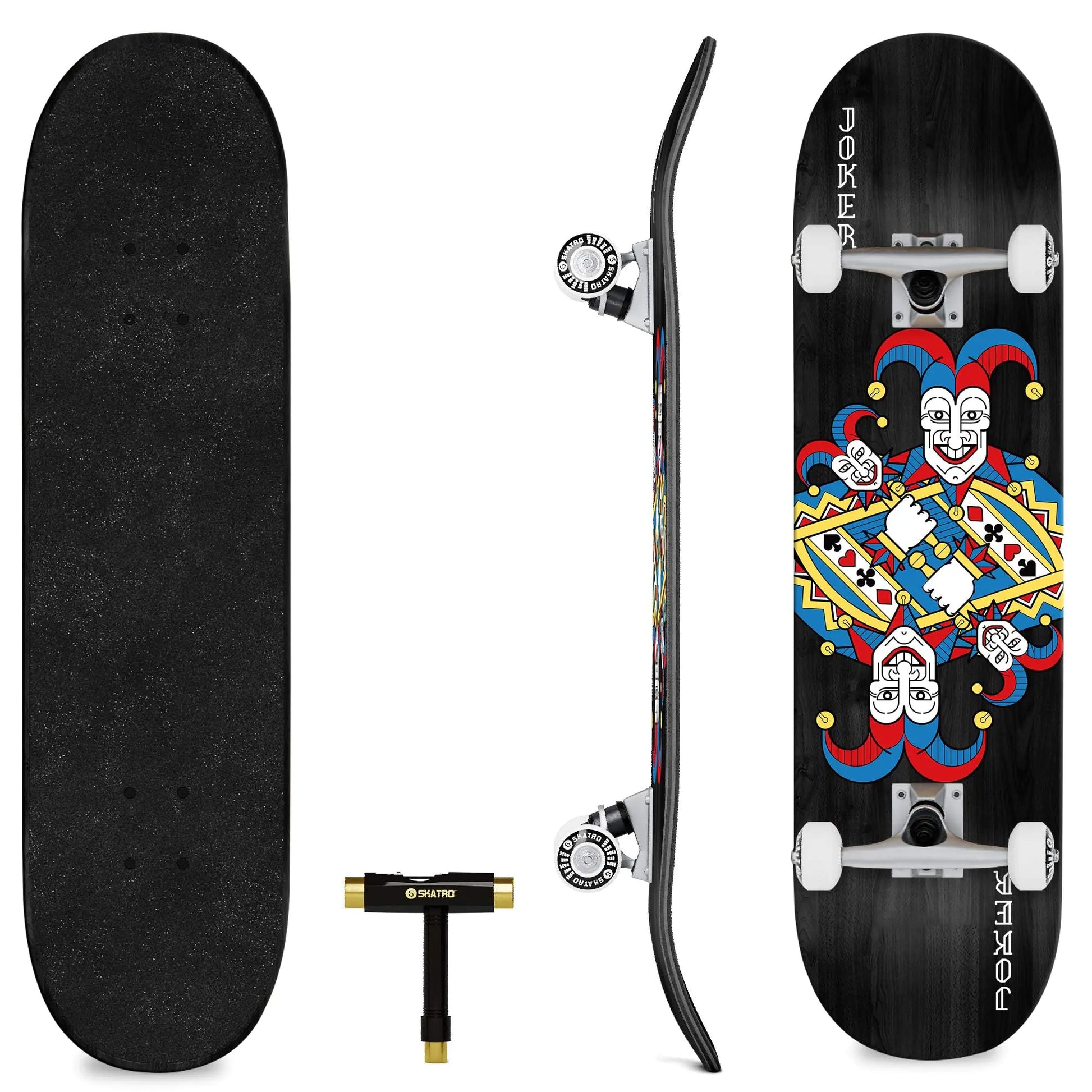 [PERFORMANCE - 31" length x 8" width. 50mm x30mm 95A High Performance wheels ABEC 7- Ultra speed stainless steel bearings 5 inch durable and lightweight aluminum trucks SKATRO Adhesive technology - A proprietary adhesive technology that not only moulds all 7 wooden layers together but also acts as structural reinforcement. This thin layer of structural reinforcement makes skatro boards comparable to 8 layer boards in strength while still having the flex and agility seen in 7 layer boards. This technology is exclusive to Skatro AMAZING VALUE - Skatro outperforms many of the premium leading brands and sells for a fraction of the cost. Includes a FREE t-tool. This is a $10 Value. PERFECT SIZE - Optimal wood board size is perfect for cruising tricks olllie kickflips. Better than a longboard or mini cruiser board. COMPLETE SKATEBOARD - 7 layer Maple Wood Skateboard is perfect for everyone: skateboards for kids skateboards for girls skateboards for beginners boys skateboard]