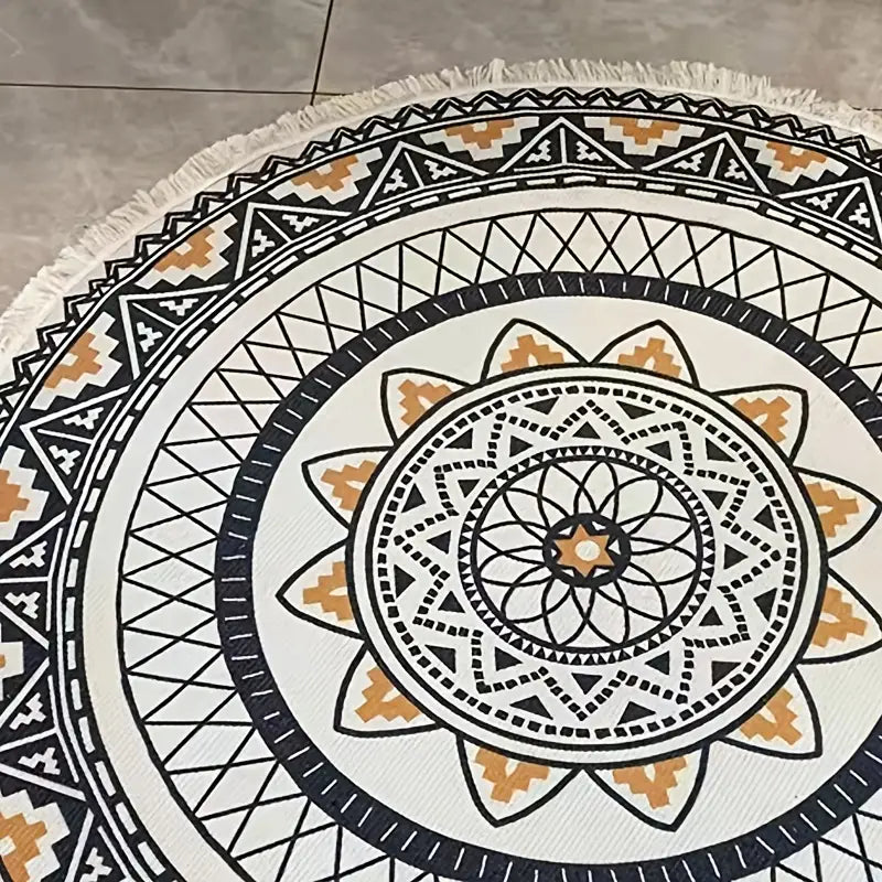 Transform your living space with our stunning Tassel Round Rug, featuring a captivating retro ethnic style that adds a touch of elegance to any room. This versatile carpet, measuring 31.49 x 31.49 inches (80 x 80 cm), is perfect for your living room, bedroom, study, dining room, kitchen, bathroom, foyer, balcony, or even commercial spaces.