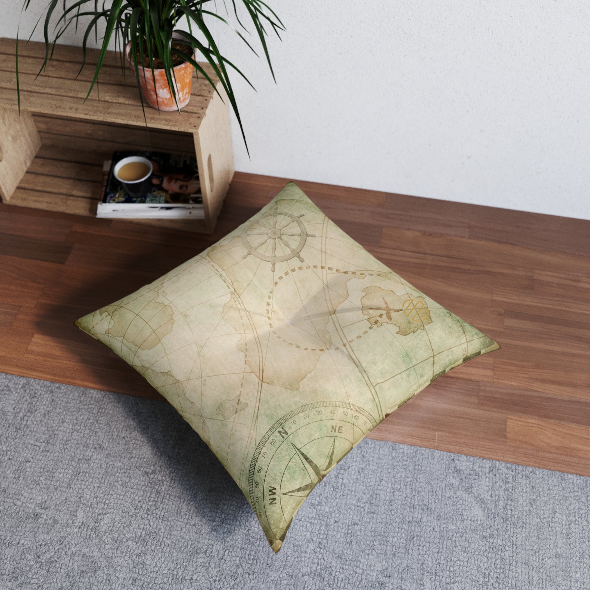 A square tufted floor pillow that brings quiet, vintage wanderlust into any cozy corner. The printed side shows a faded treasure map and compass rose in soft sepia and sea-glass tones, like a page unearthed from an old captain’s log. The reverse is a warm, leather-brown field that grounds the design and adds versatile warmth to a reading nook or den. Plush yet structured, the pillow holds its shape for casual floor seating, meditative corners, or layered on a low sofa. It reads like an invitation to slow afternoons, map tracing, and storytelling—an accent that feels lived-in and thoughtfully weathered rather than bright or new.