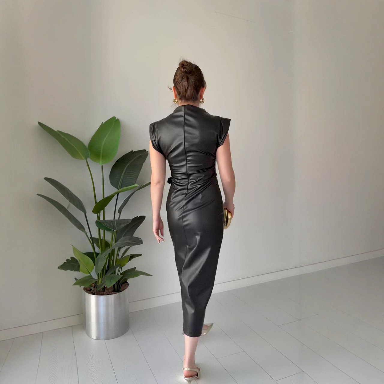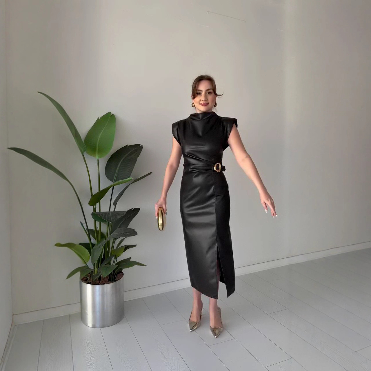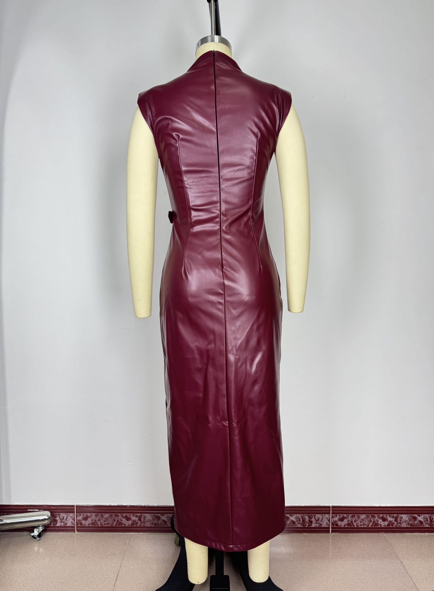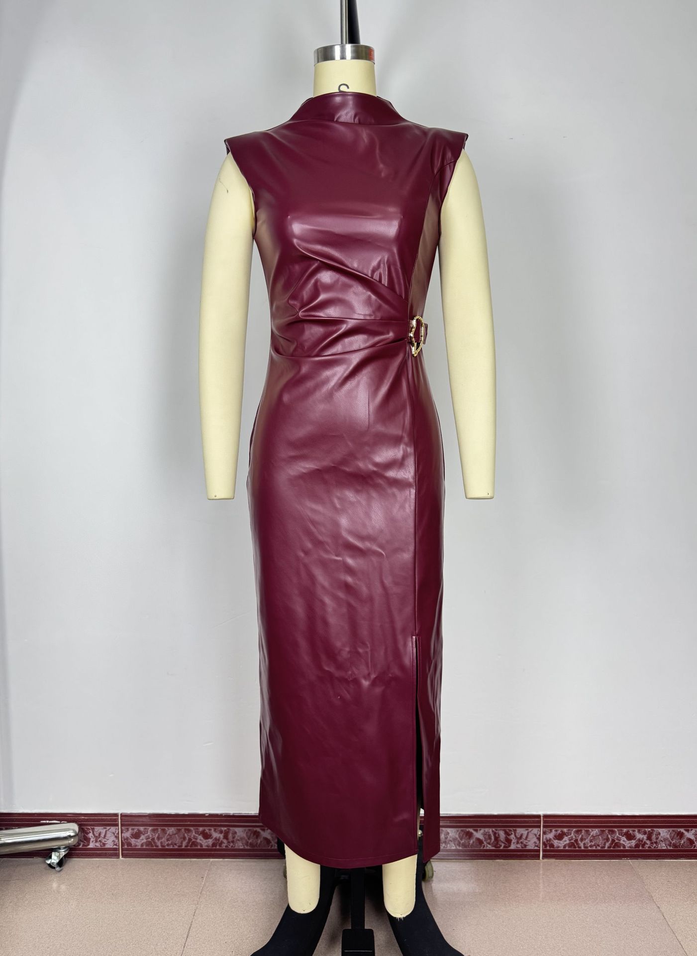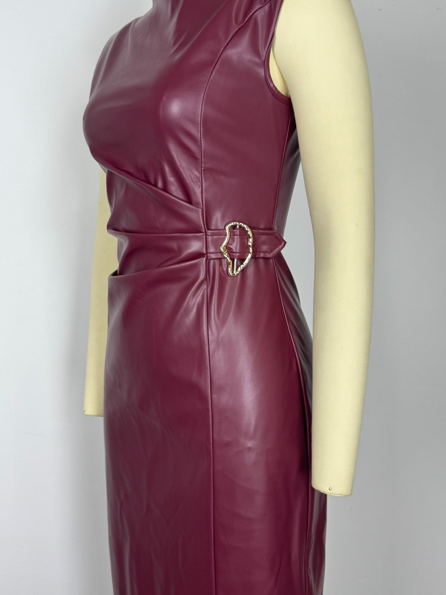 Waist-tight Round Neck Casual Dress - PU Leather
